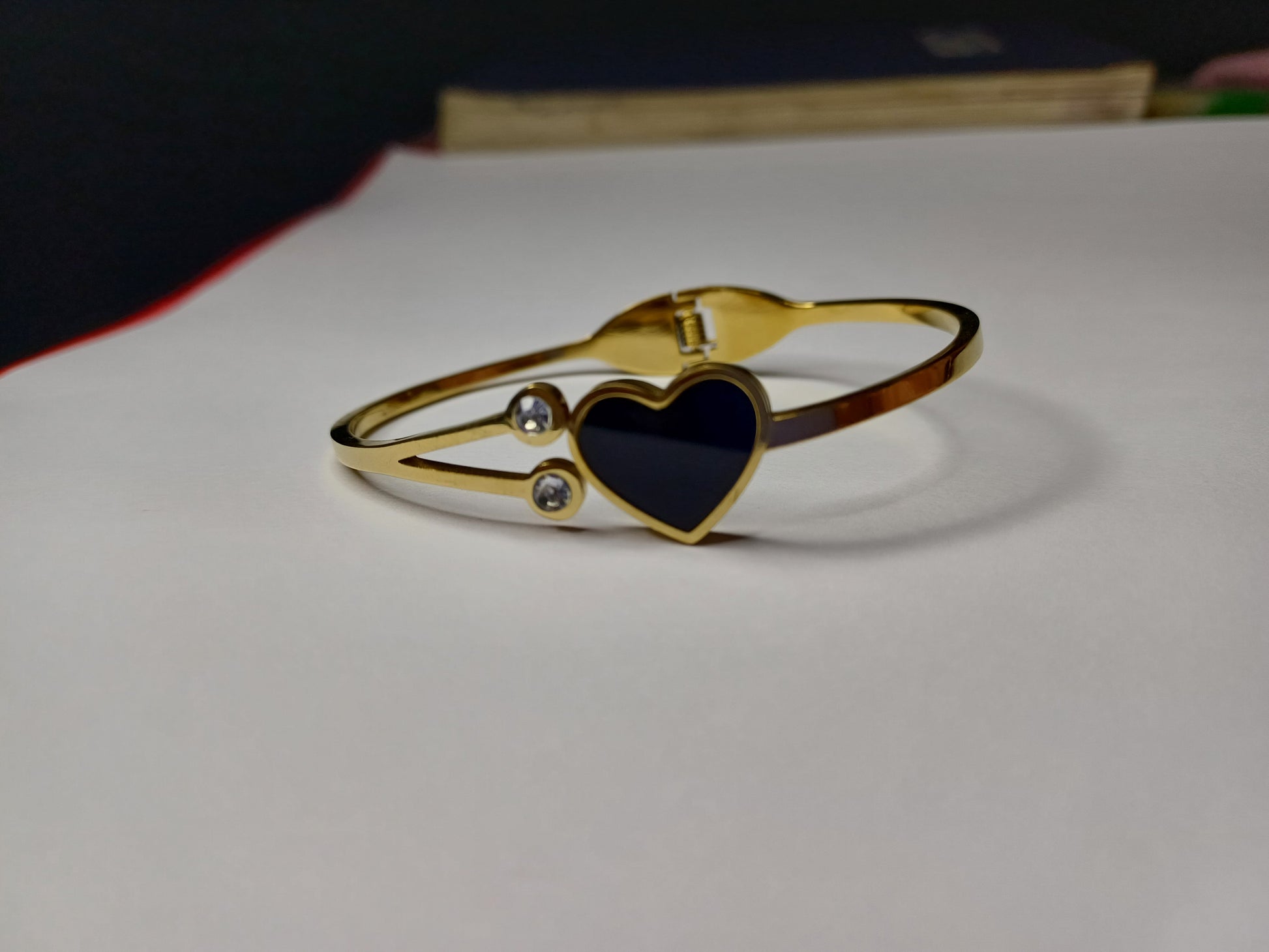 The Midnight Heart bracelet combines modern minimalism with a touch of romance. Featuring a sleek black enamel heart centerpiece framed in radiant gold, accented by two shimmering crystals, this bangle is designed to elevate any outfit — from casual days to special nights out.